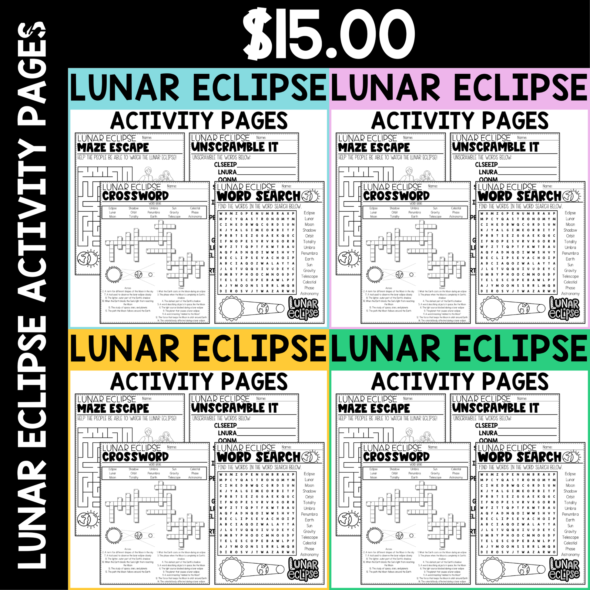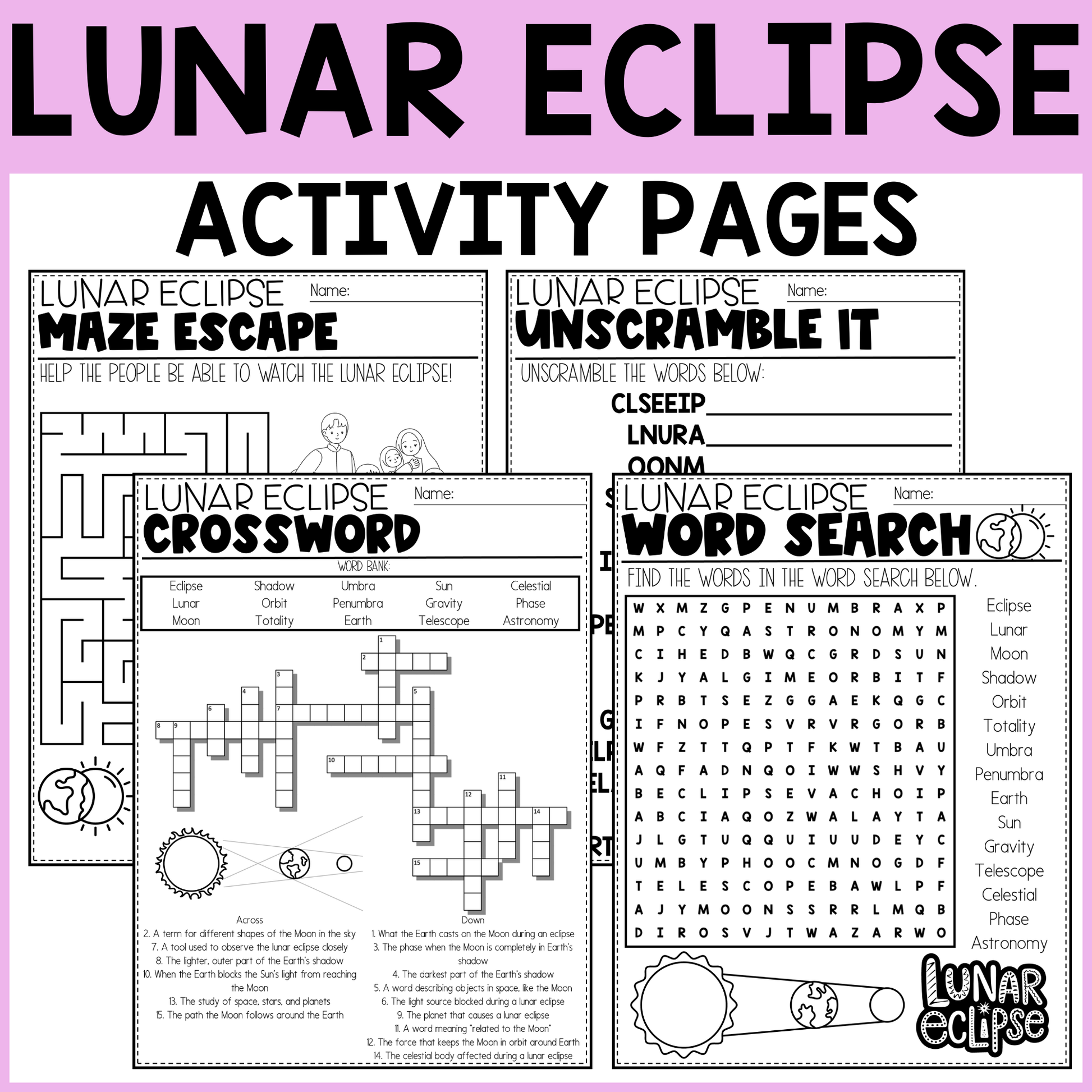 ✔ Lunar Eclipse activities such as a word search, crossword, word scramble, Learn and Lable, and a maze
