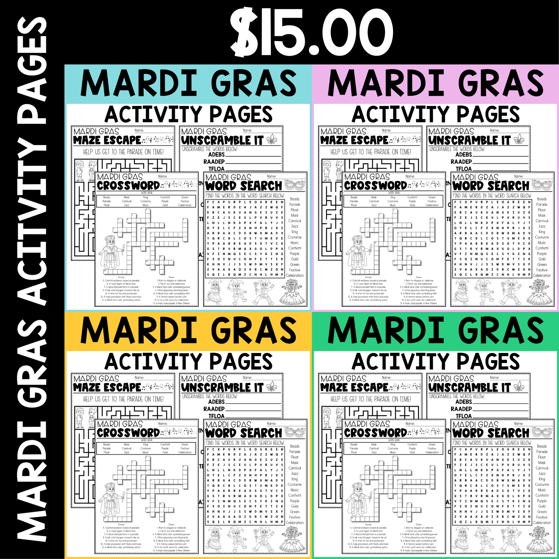 ✔ Mardi Gras activities such as a word search, crossword, word scramble, and a maze